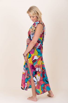 Lenge anyagból készült hosszú strandruha, nyakrésze keskeny pánttal állítható. Mindkét oldalát hasíték teszi szellőssé. Kellemes viselet, amely tökéletes meleg nyári napokon a tengerparton és séta közben is.